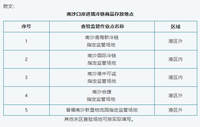 三、南沙國際冷鏈指定監(jiān)管場地計劃于10月25日開展冷鏈查驗作業(yè),但目前暫不具備凍肉和冰鮮水產(chǎn)品指定監(jiān)管場地資質(zhì),因此進(jìn)口這兩種冷鏈產(chǎn)品的企業(yè)在填寫“貨物存放地點(diǎn)”時,不得填寫南沙國際冷鏈指定監(jiān)管場地作為“貨物存放地點(diǎn)”,其他冷鏈產(chǎn)品按第二條要求執(zhí)行。