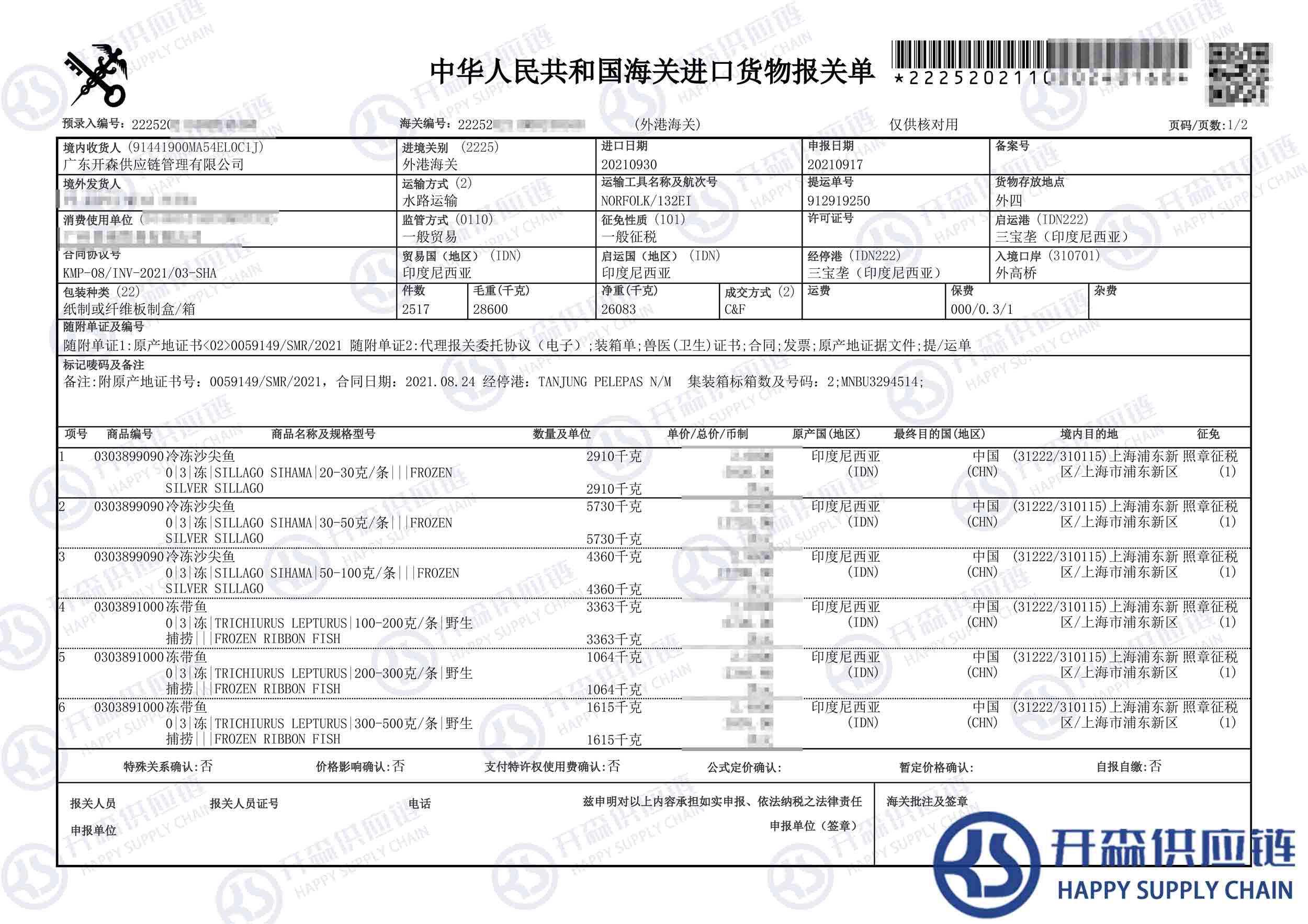 【本文結語】 上述就是印度尼西亞冷凍沙尖魚進口報關代理服務【經典案例】的全部內容,希望能對您有所幫助,如有水產品進口報關上任何疑問及問題可隨時在線聯(lián)系我們或撥打 18002611553,開森供應鏈擁有豐富的水產品進口報關操作經驗及案例,10余年進口經驗為您所用,各類進口疑難都能為您一一解答及協(xié)助快速處理解決!
