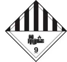 對瓦特小時的額定值不超過100Wh的移動電源(鋰離子電池組),如符合聯(lián)合國《關(guān)于危險貨物運輸?shù)慕ㄗh書 規(guī)章范本》(第20修訂版)第3.3章188特殊條款等相關(guān)規(guī)定可免除標簽的要求。對瓦特小時的額定值大于100Wh的移動電源(鋰離子電池組),其運輸包裝上應加貼下圖中9A號危險性運輸警示標簽。