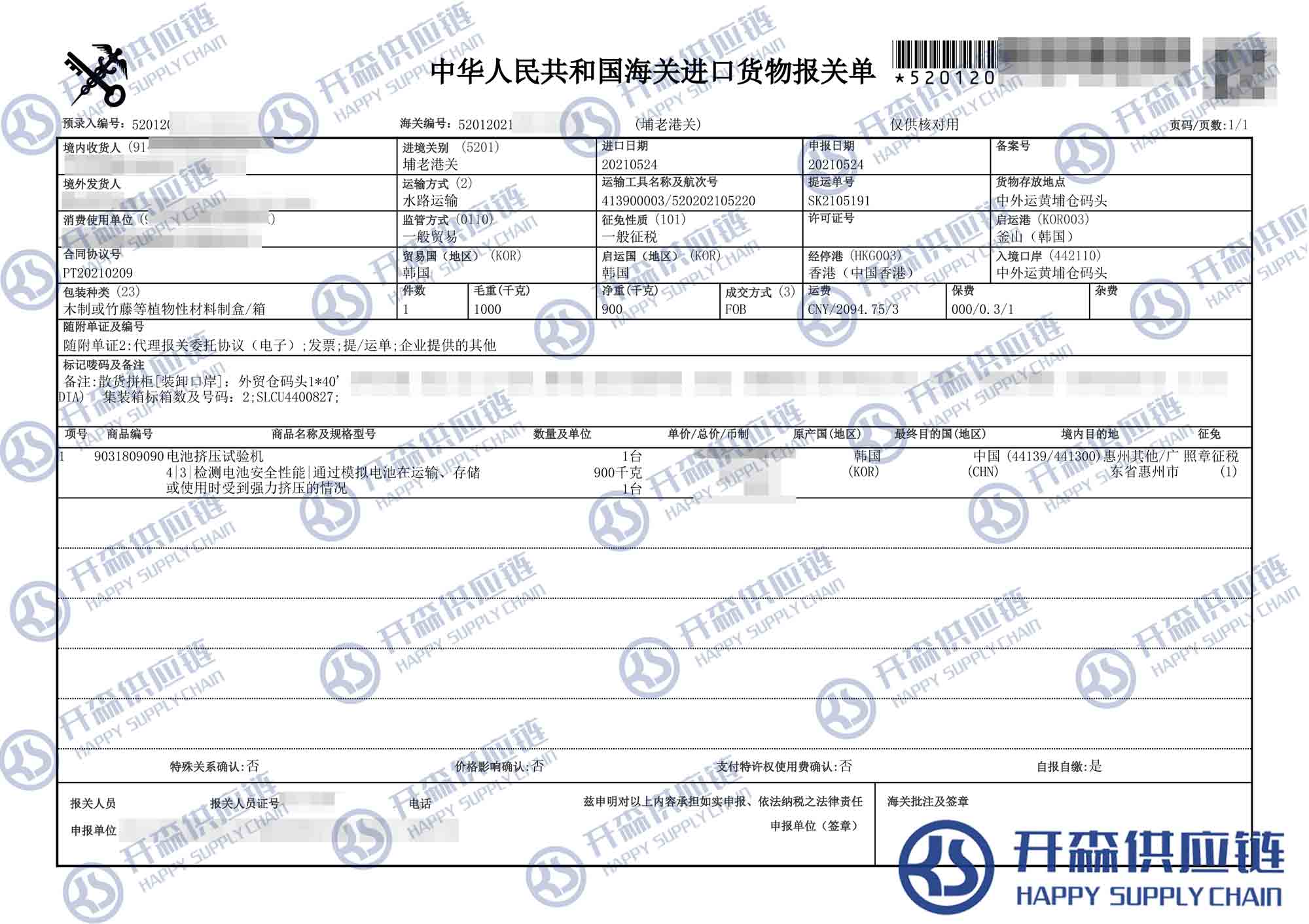 韓國電池?cái)D壓試驗(yàn)機(jī)進(jìn)口報(bào)關(guān)代理服務(wù)【進(jìn)口案例】